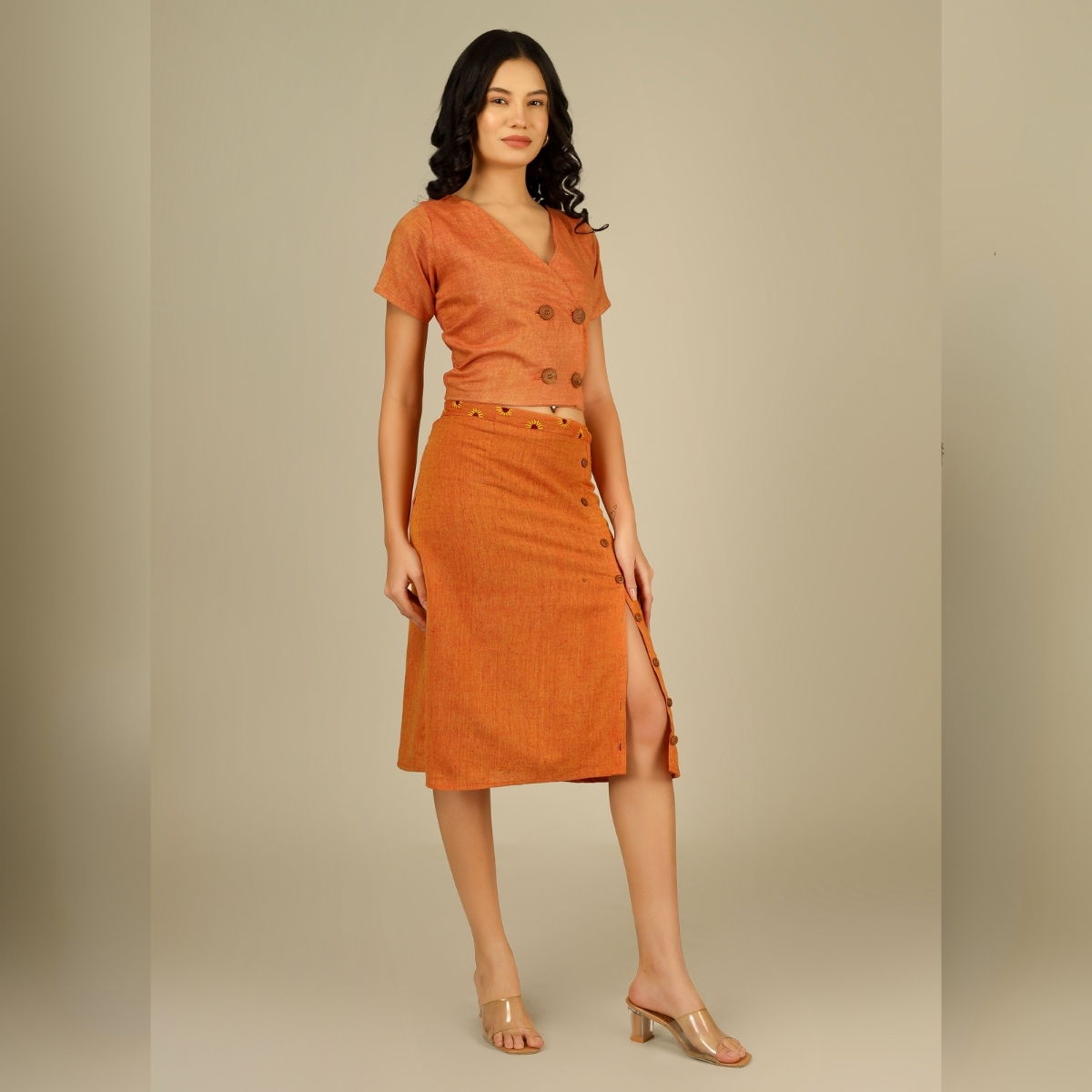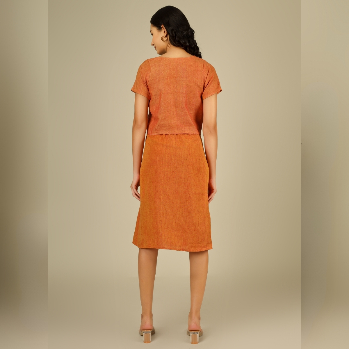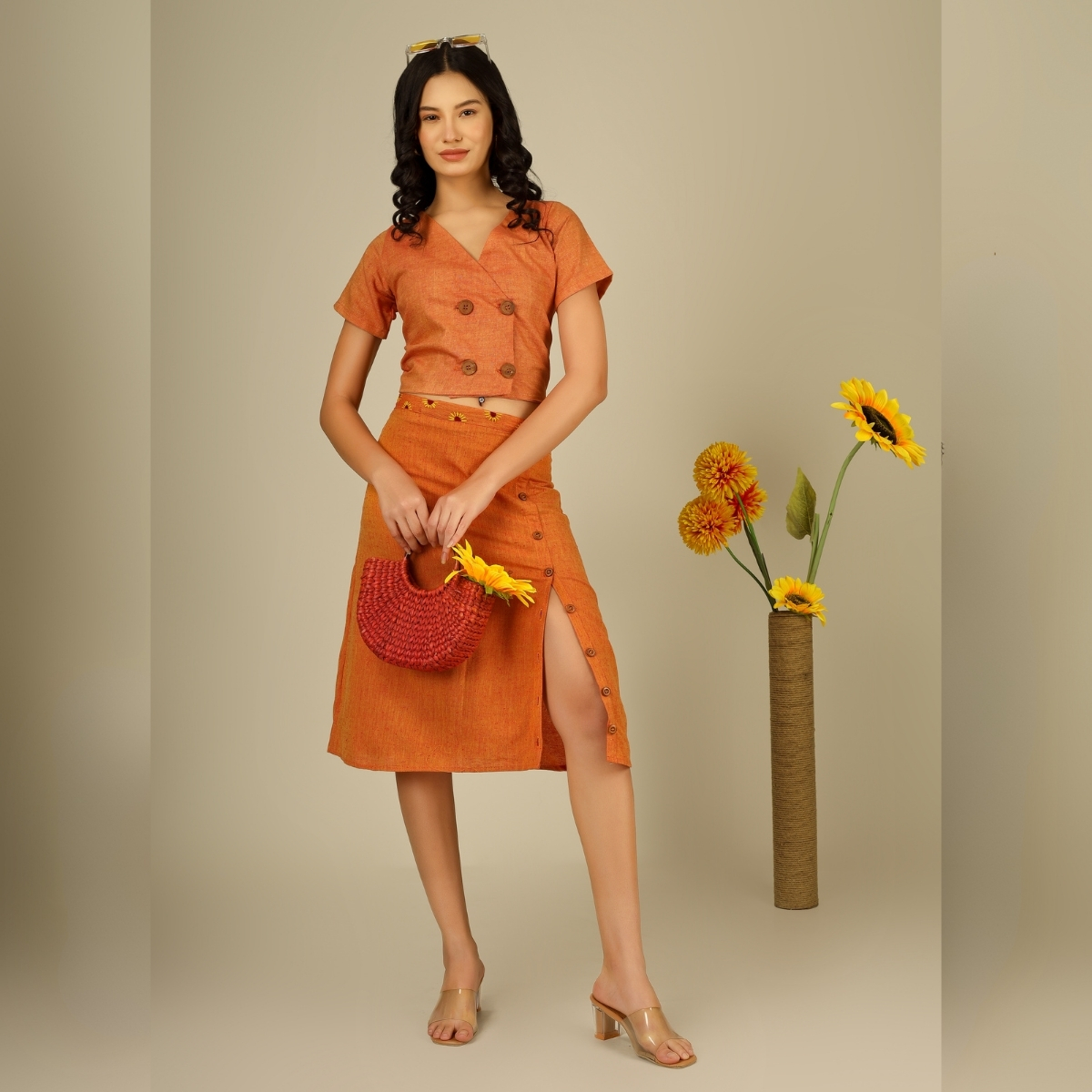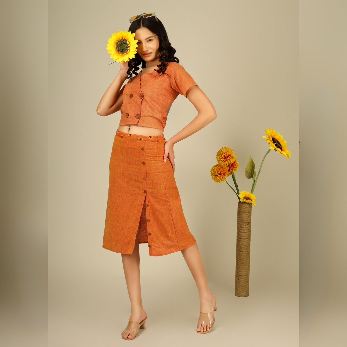 Bright orange co-ord set featuring a cross-pattern crop top and A-line midi skirt with slit and sunflower embroidery. Made from 100% khadi cotton for a breezy, natural feel